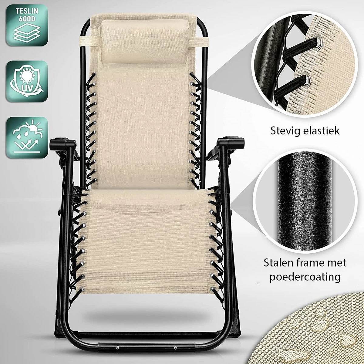 Deze stoel heef een gepoedercoat metalen frame dat weerbestendig is. De zitting van de stoel is van duurzaam en ademend polyester. Deze stof zorgt ervoor dat je het in de zomer niet te heet krijgt in de stoel. Het zachte hoofdkussen is in hoogte verstelbaar en ook afneembaar. De armleuningen zijn ergonomisch gevormd. De stoel kan traploos versteld worden zodat je altijd de meest comfortable houding kunt vinden.